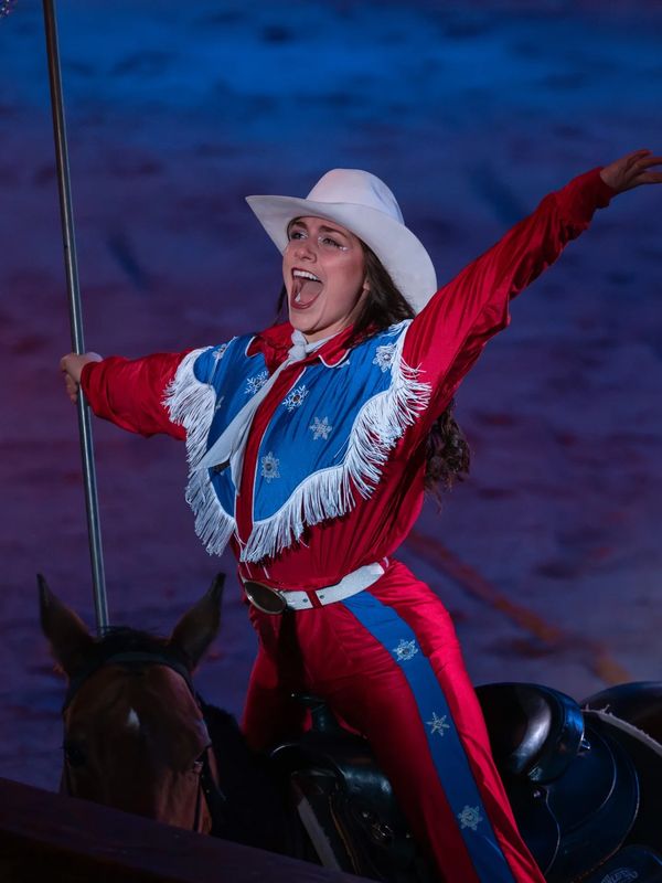 She was immediately hired by The Dancing Horses Theatre in Wisconsin, where she performed over 900 aerial and equestrian acts. Erika currently performs at Dolly Parton’s Stampede, appearing in more than 330 shows and over 1,500 acts to date.